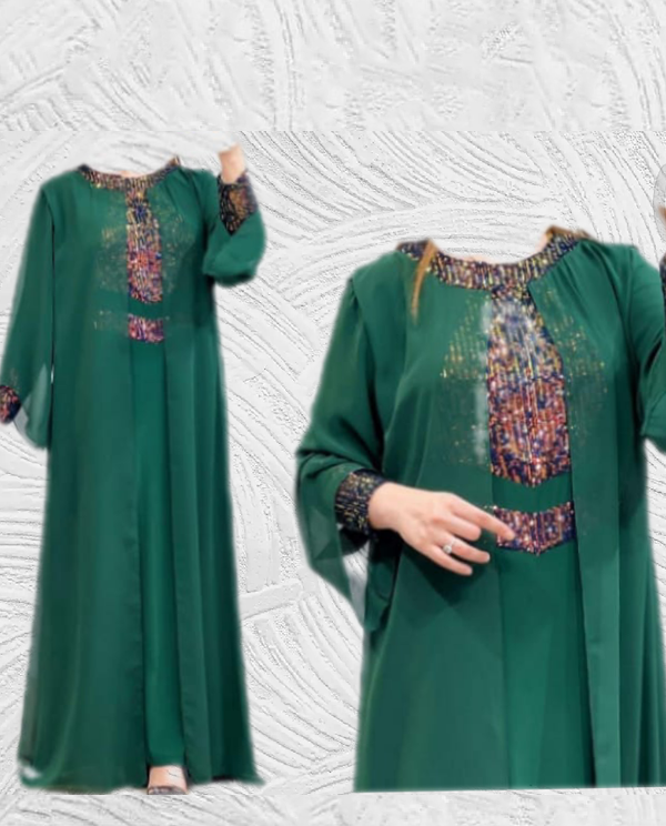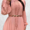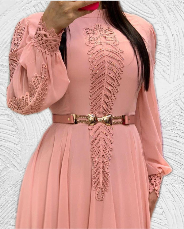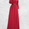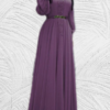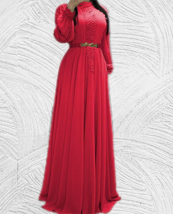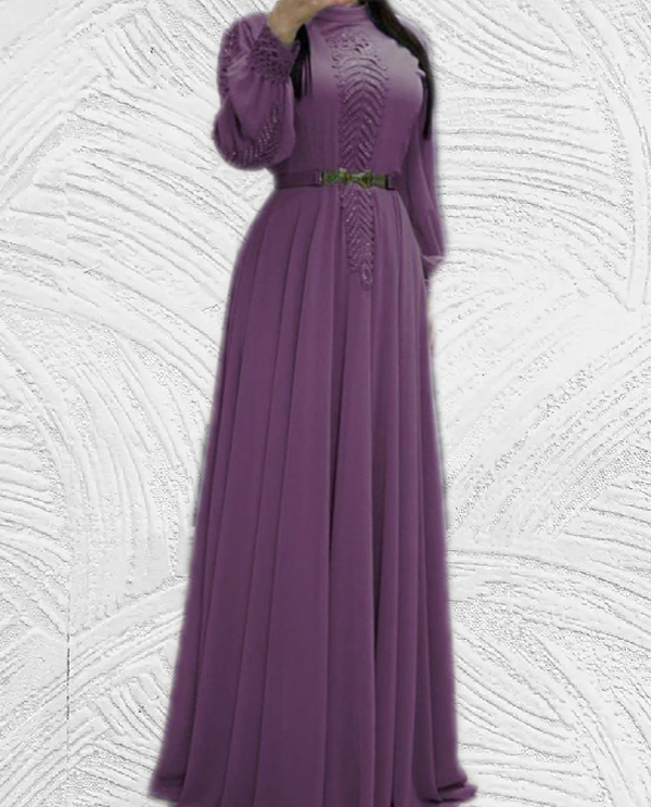 This stunning floor-length gown has a high neck, with long slightly puff sleeves is designed with soft and thick chiffon print, gathered at the waist. The neat flowy flow from the waistline down to the floor leaves that desired feminine elegant look.