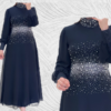 This classic above-the-ankle-length gown has a beaded alter neck and puffy sleeves is designed with soft and sleek chiffon print, with a simple flare cut. The neat flare flow from the waistline to the ankle gives it a classy and unique poise