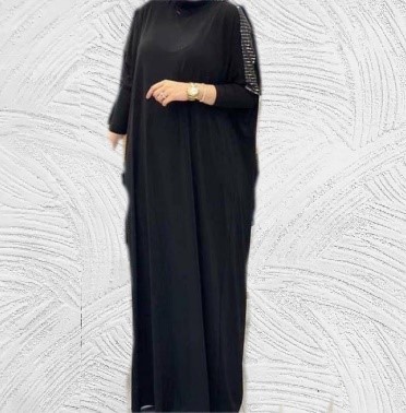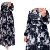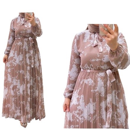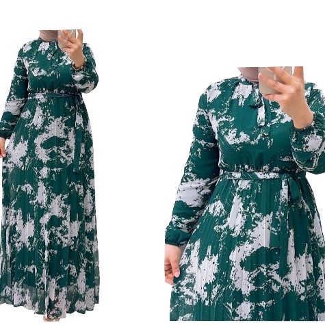 An elegant chiffon floor-length patterned dress designed gathered at the waist with the tiny plastic band with long slim sleeves