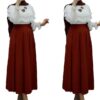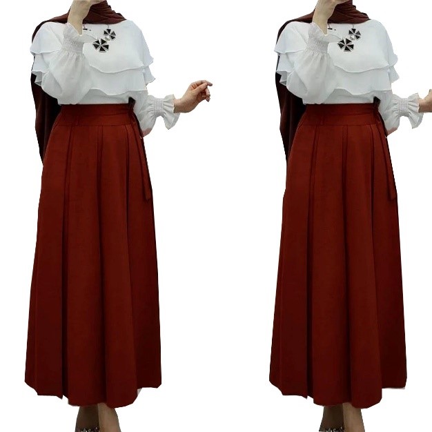 Long crepe skirt, with kissing pleat design and long-sleeved white top.